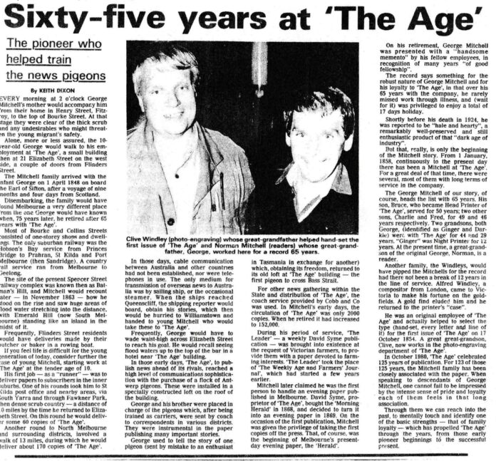 The record says something for the robust nature of George Mitchell and his loyalty to The Age, in that over his 65 years with the company, he rarely missed work through illness, and (wait for it) was privileged to enjoy a total of 17 days holiday.