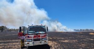 BENALLA, VIC. — A major grass fire has broken out as strike teams assemble at Glelrowan CFA Fire Station.