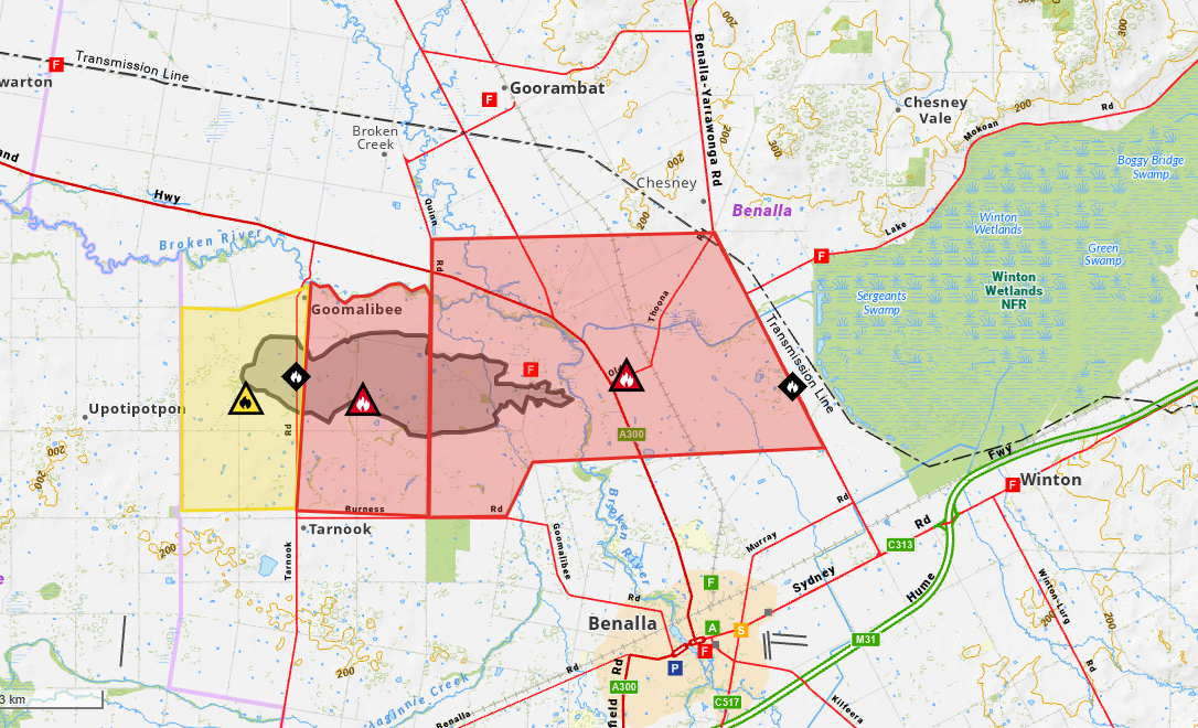 People in the warning area should leave immediately in a southerly direction towards Benalla. There has now also been a “burn over”.