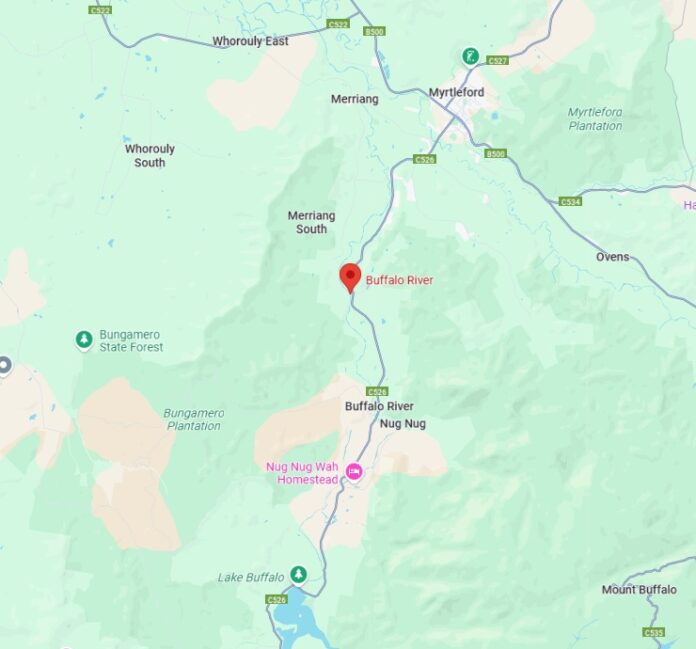 The car was sighted by a passerby in waters off Buffalo River Road, south of Myrtleford, about 9am.