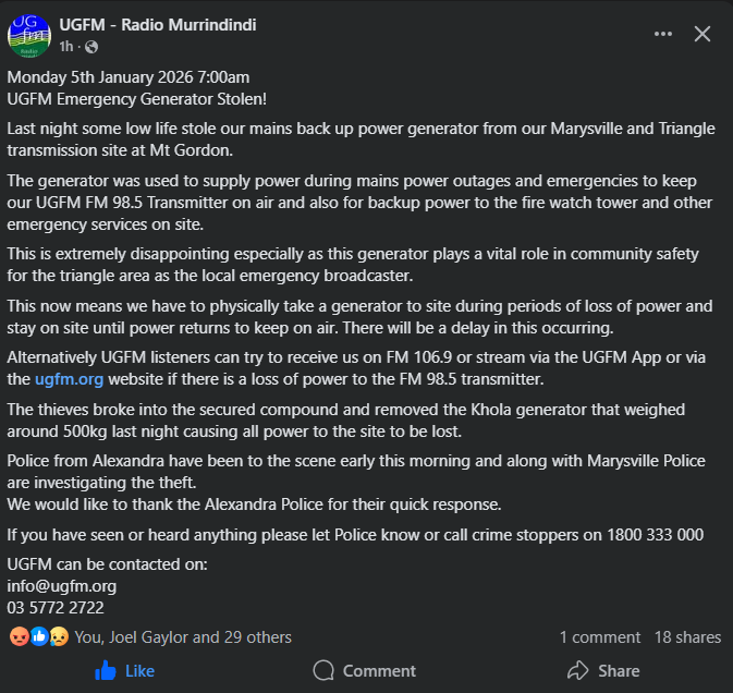 One theft of particular note was the theft of a $20,000 generator at Mount Gordon, which ensures that local radio (UGFM) can transmit emergency information during power outages.
