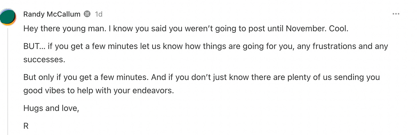 I’ve never met Randy McCallum before in my life. I have no idea what he looks like. I have no idea where he lives or how he even found my writing in the first place earlier this year. I just know he is a guy who subscribes to my Substack.