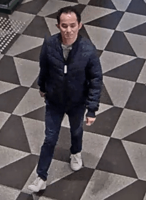 The offender is described as approximately 170cm tall, 30-40 years old with black and grey hair, wearing a navy puffer jacket, navy jeans and white sneakers.