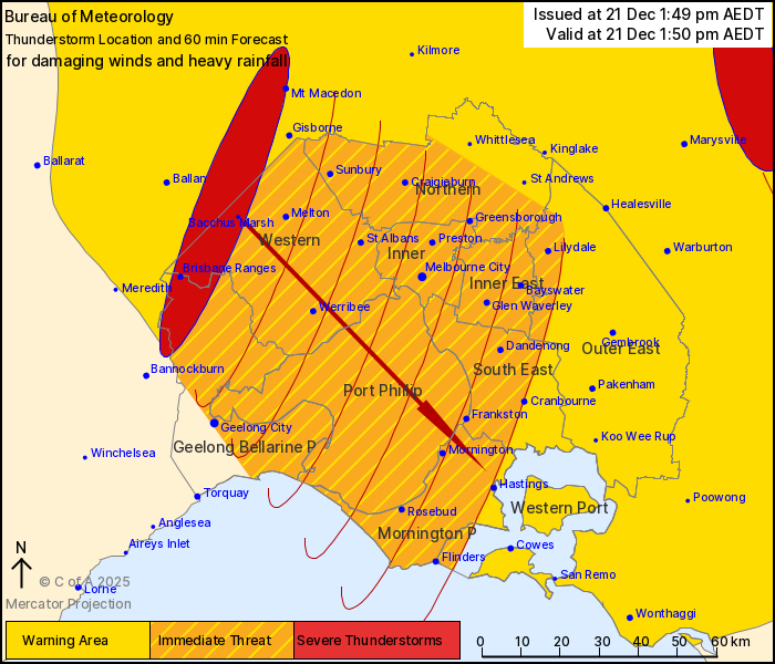 MELBOURNE, VIC. — The Bureau of Meteorology warns that, at 1:50 pm, severe thunderstorms likely to produce damaging winds and heavy rainfall that may lead to flash flooding were detected near Bacchus Marsh, Brisbane Ranges and the area northeast of Marysville.