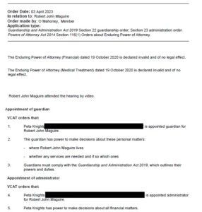 The enduring Power Of Attorney was revoked on Monday, April 3, 2023, when the family member gained a guardianship order over Father Bob according to VCAT documents seen by VicNews.