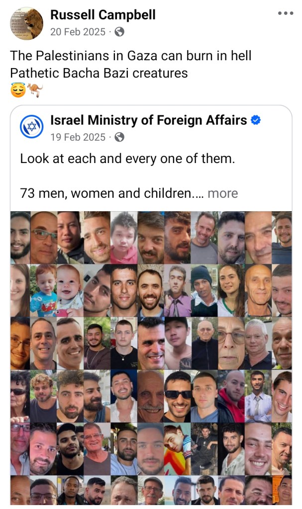 But Campbell has escaped any hate crime charges, despite posting on three separate occasions in February 2025 soon after his return to Australia, about his clear genocidal hatred for Palestinians, all of whom he wished to “burn in hell”, as well as being involved in another unsavoury incident in Merrylands six months before the viral assault took place.