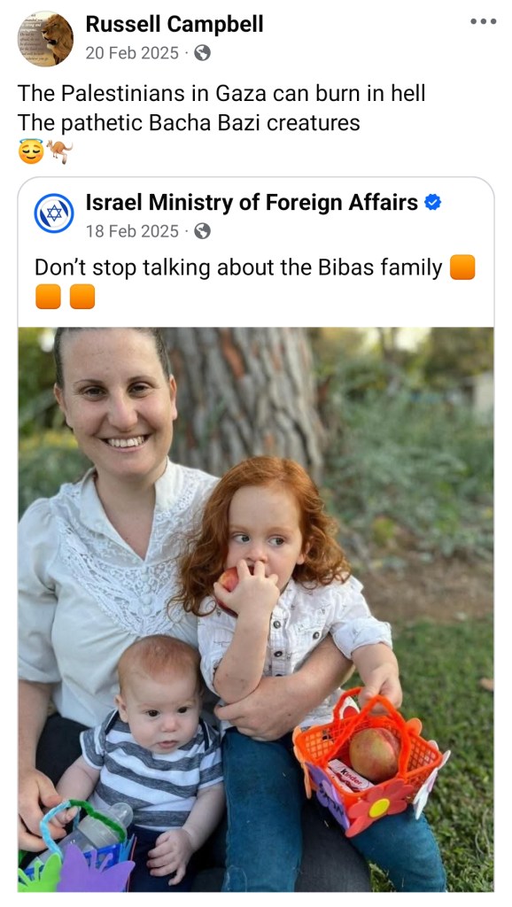 NSW Police, meanwhile, claimed with a straight face that Campbell’s actions “did not meet the threshold” to charge him with any hate crimes. True News Weekly then provided evidence to NSW Police where Campbell publicly stated his genocidal hatred for Palestinians on at least three occasions.