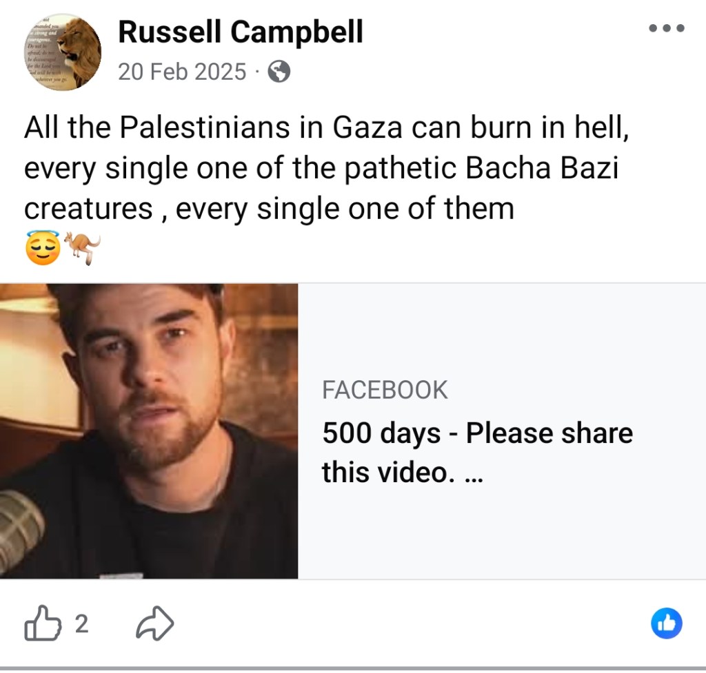 Campbell, however, has somehow escaped any charges related to the newly installed hate and extremism laws, despite his anti-Palestinian stance and intent being clear during the videotaped assault in Merrylands on Saturday, March 28 and his own public posting of genocidal and violent hatred about Palestinians just a year before the incident, where he openly stated about how he wanted “every single” Palestinian in Gaza to “burn in hell”.