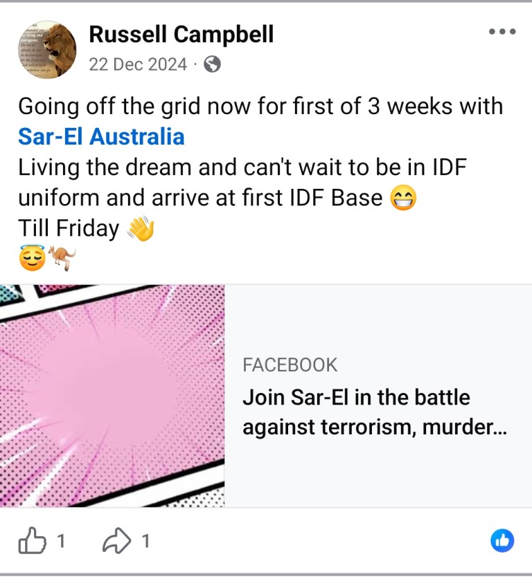 A check of his social media posts shows that Campbell joined the IDF through Sar-El: a so-called “non-profit service organization, subordinate to and under the direction of the Israeli Logistics Corps” who offer individuals the opportunity to “become an Australasian volunteer to assist the IDF … on base”.