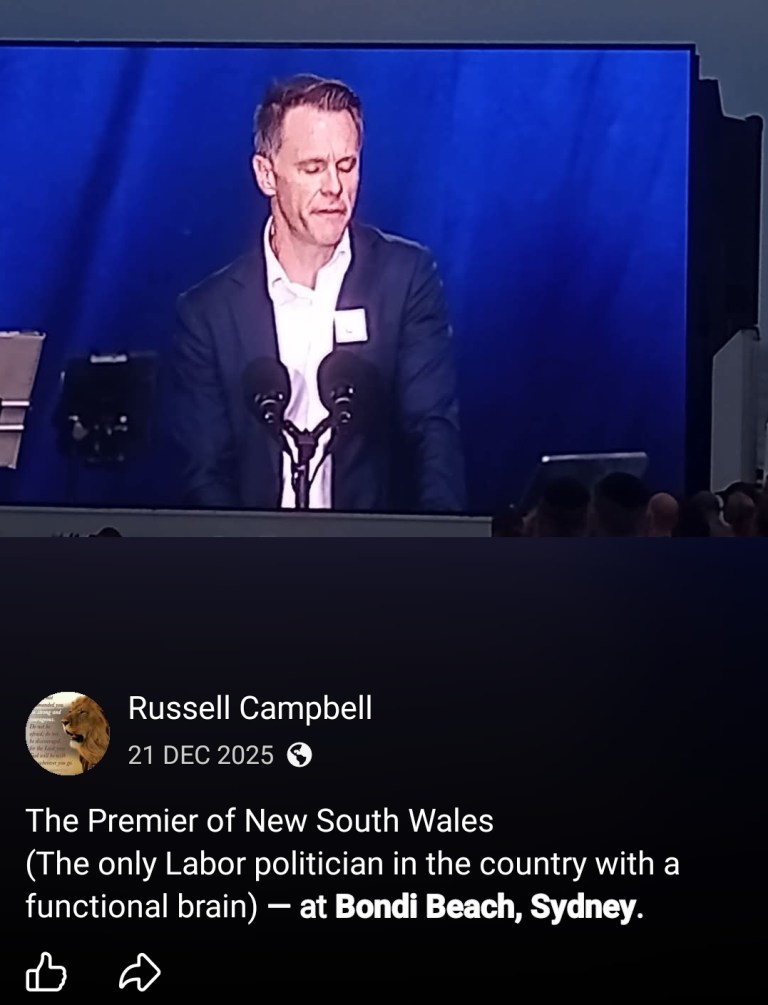 Widely derided by many as ‘Mossad Minns’ for his subservience to Israel, Campbell’s Facebook page however, reveals him to be a big fan of NSW Premier Chris Minns, claiming the embattled premier is the “only Labor politician in the country with a functioning brain”.