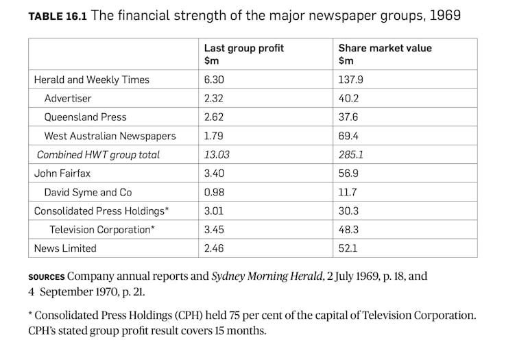 In another table, Young lists all the major interests and assets held by the five media monsters as they stood in 1969: HWT, Fairfax, David Syme and Co (in partnership with Fairfax), Consolidated Press (the Packer organisation) and News Limited (Rupert Murdoch).